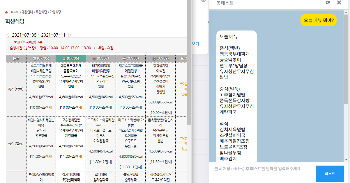 아직 남아있는 문제점은, 크롤링 해오는 데이터가 이번주 메뉴이기 때문에, 저번주 메뉴를 질의한다고해도 이번주 메뉴로 출력되는 상황이다. 예외처리 부분이 남아있음