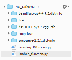 카카오톡 인천대학교 학식봇 만들기(AWS Lambda) - 8 (0) 2021.07.12 카카오톡 인천대학교 학식봇 만들기(AWS Lambda, layer) - 7 (0) 2021.07.09 카카오톡 인천대학교 학식봇 만들기(AWS Lambda) - 5 (0) 2021.07.05 카카오톡 인천대학교 학식봇 만들기(크롤링) - 4 (0) 2021.07.02 카카오톡 인천대학교 학식봇 만들기(크롤링) - 3 (0) 2021.07.01