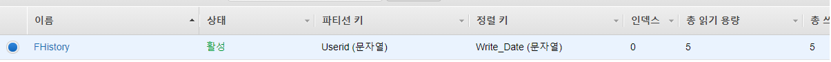 DynamoDB 테이블을 생성한 화면 테이블의 이름은 FHistory로, 파티션키를 Userid로 갖고 정렬키를 Write_Date로 가지는 테이블이다.