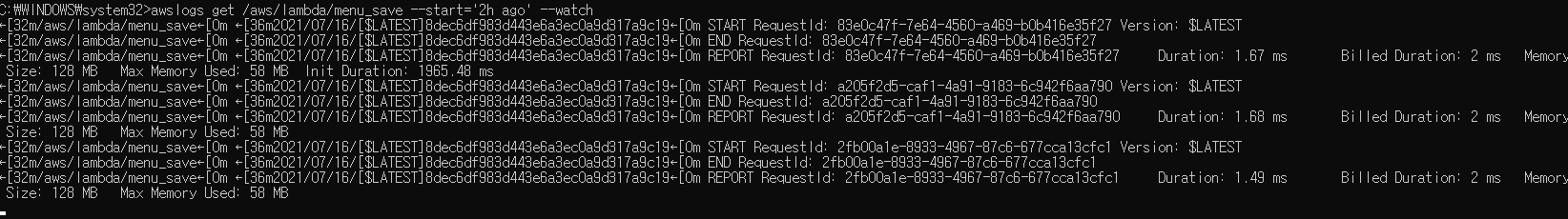 awslogs 사용 화면 request를 보내자마자 바로 로그가 출력되는것은 아니였지만, 몇 초 이내로 출력되어서 개발에 충분히 도움이 됐다.