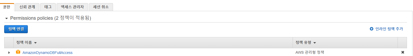 위 그림과 같이, 여기서 DynamoDBFullAccess라는 권한을 추가해주면, lambda에서 정상적으로 DynamoDB에 접근 할 수 있게 된다.
