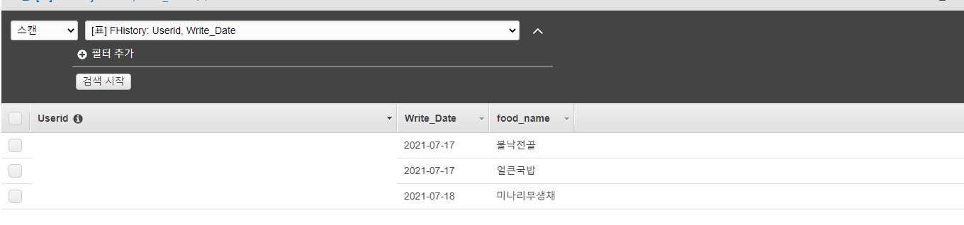 왠지 Userid는 가려야 할것 같아서 지운 그림(Dynamo DB) 그래서 이전에 등록해두었던 음식 DB를 이용해 Userid, Write_Date와 함께 위와 같이 DB 저장에 성공했지만..