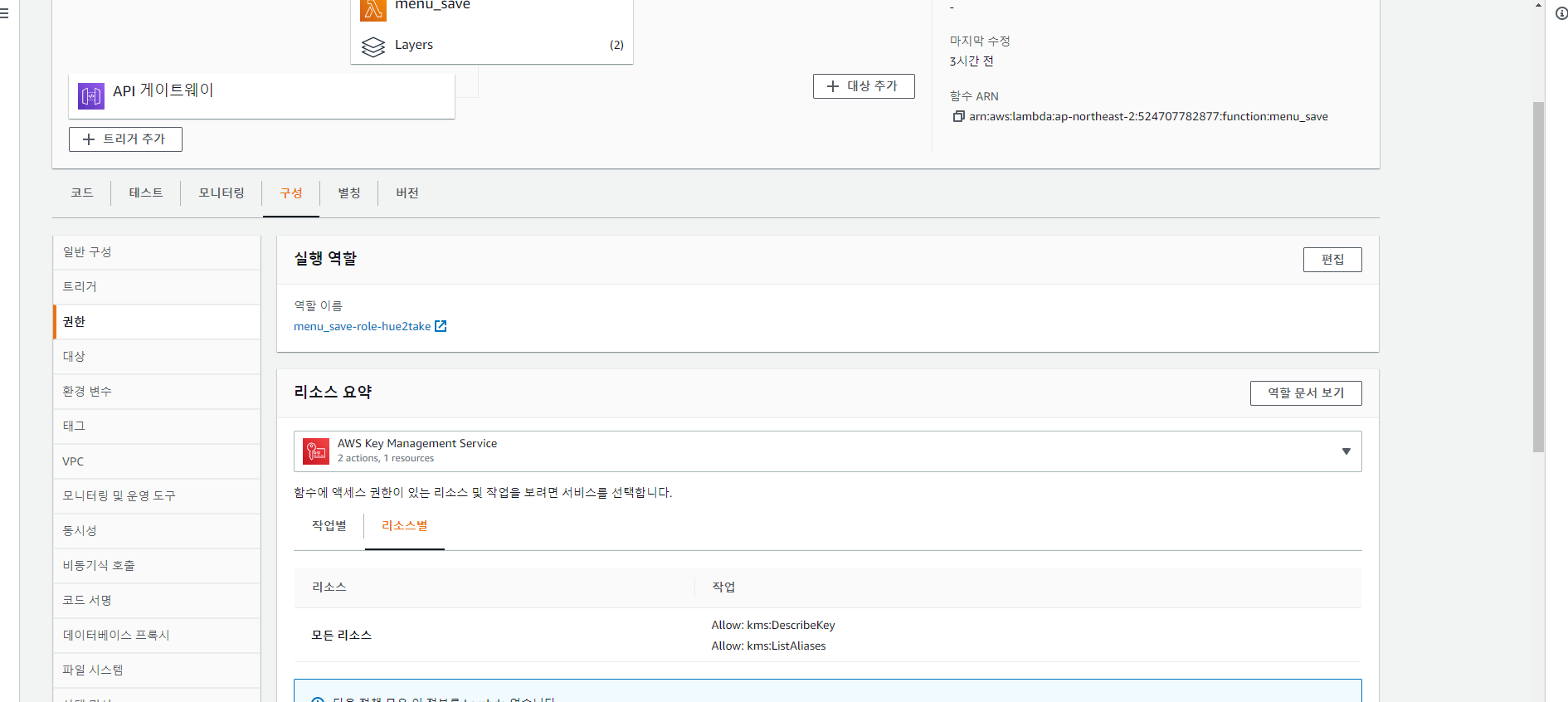 그림에 보이는 화면에서, 역할 이름 밑의 하이퍼링크로 들어가면 lambda 서비스에 권한을 추가해줄 수 있다.