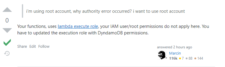 명쾌한 답변을 주신 ... 감사합니다 ㅠ ㅠ 역시 개발자 포럼이라는 생각을 하며, 계정 권한이 아닌 lambda 서비스에 권한을 따로 할당해야 한다는것을 알게 되었다.