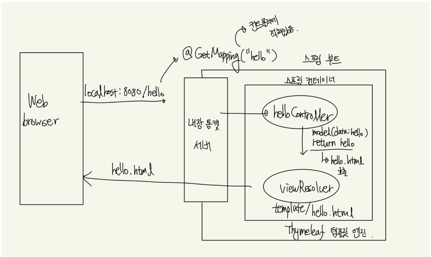 localhost에서 호출한 이름의 GetMapping 어노테이션이 있다면, 컨트롤러에서 해당 부분을 실행한 후 return하게되면 ViewResolver로 return한 이름이 넘어가게되어 template 디렉터리 하위의 html 페이지를 코드에 따라 변경한 후, 띄움.