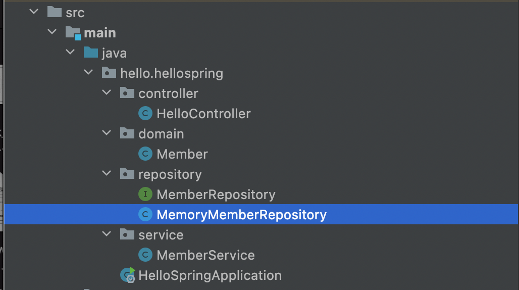 과 같은 형태로 정의했다.package hello.hellospring.domain; public class Member { private Long id; private String name; public Long getId() { return id; } public void setId(Long id) { this.id = id; } public String getName() { return name; } public void setName(String name) { this.name = name; } }이제 이 회원 정보를 관리하는 부분을 구현해야 하는데, 해당 강의에서는 DB가 정해지지 않은 상태를 전제로 진행되었기 때문에