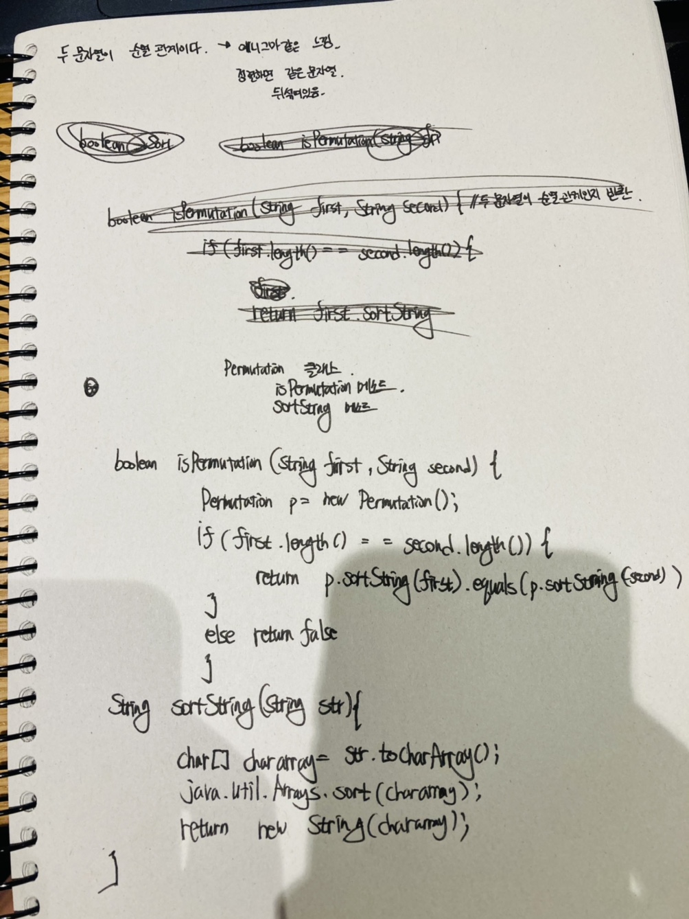 package arrayandString_2; public class Permutation { boolean isPermutation(String first, String second) { Permutation p = new Permutation(); if(first.length() == second.length()) { return p.sortString(first).equals(p.sortString(second)); } else { return false; } } String sortString(String str) { char[] arraychar = str.toCharArray(); java.util.Arrays.sort(arraychar); return new String(arraychar); } public static void main(String[] args) { Permutation p = new Permutation(); String first = "abcdef"; String second = "badffc"; System.out.println(p.isPermutation(first, second)); } }Point. 문자열을 정렬 할 때에는, java.util.Arrays 클래스에 있는 sort 메소드를 활용하자.
