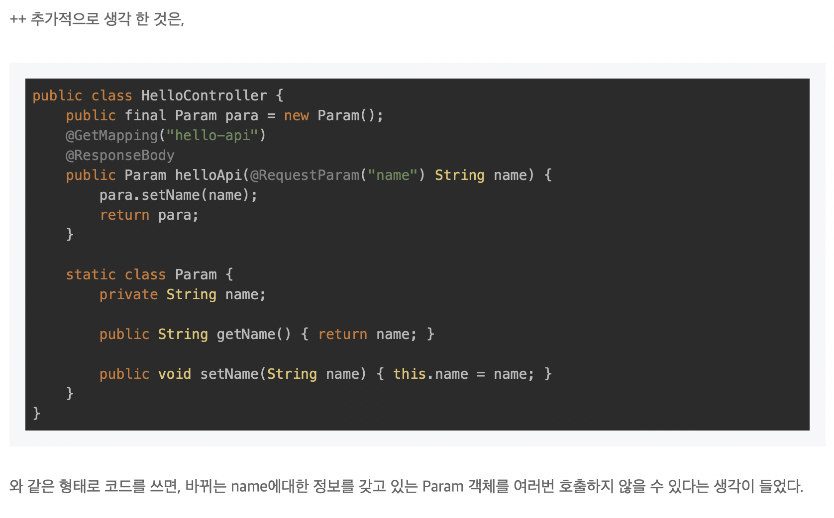 물론 사용상의 문제는 없겠지만(helloApi를 호출하는 시점에 para의 값을 set하기 때문), 이후에 누군가 getName을 했을 때 동기화 오류가 발생 할 수 있다. (getName을 한 시점이, 누군가 setName을 한 직후는 아닌지?)