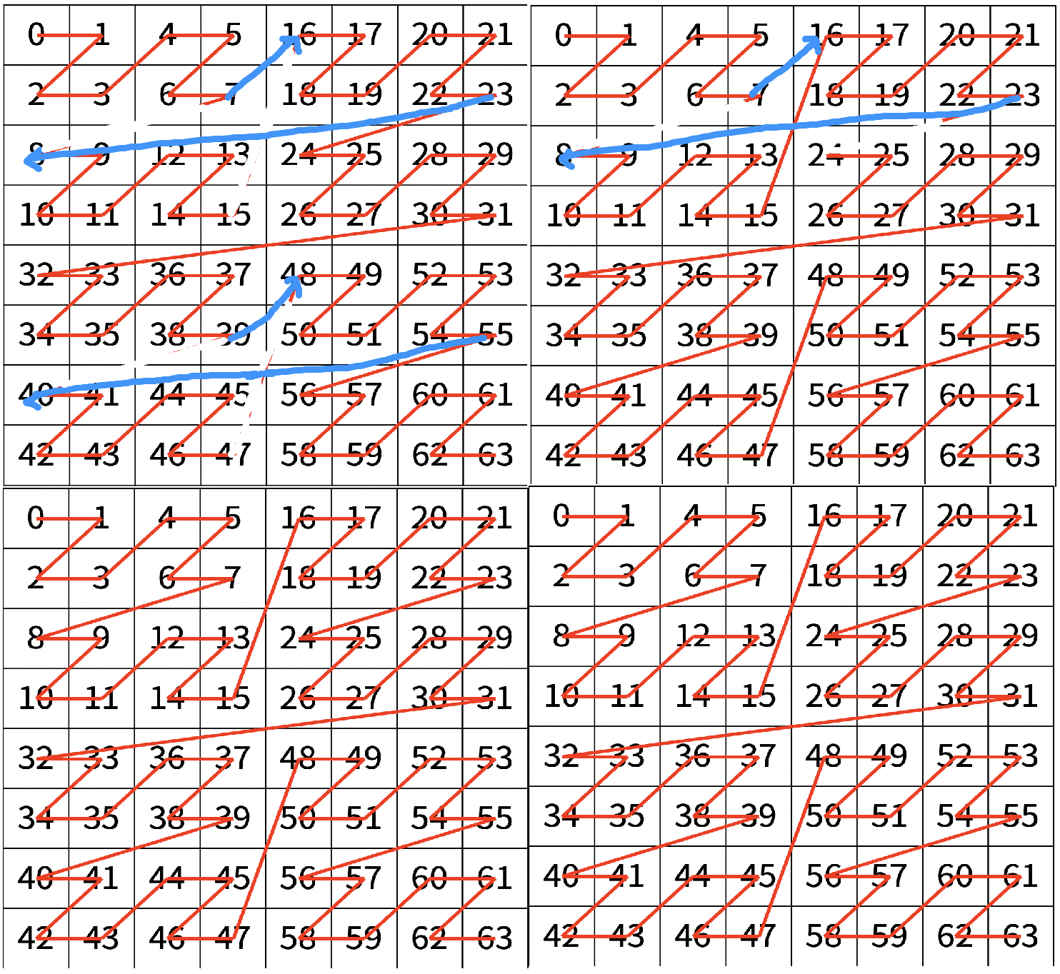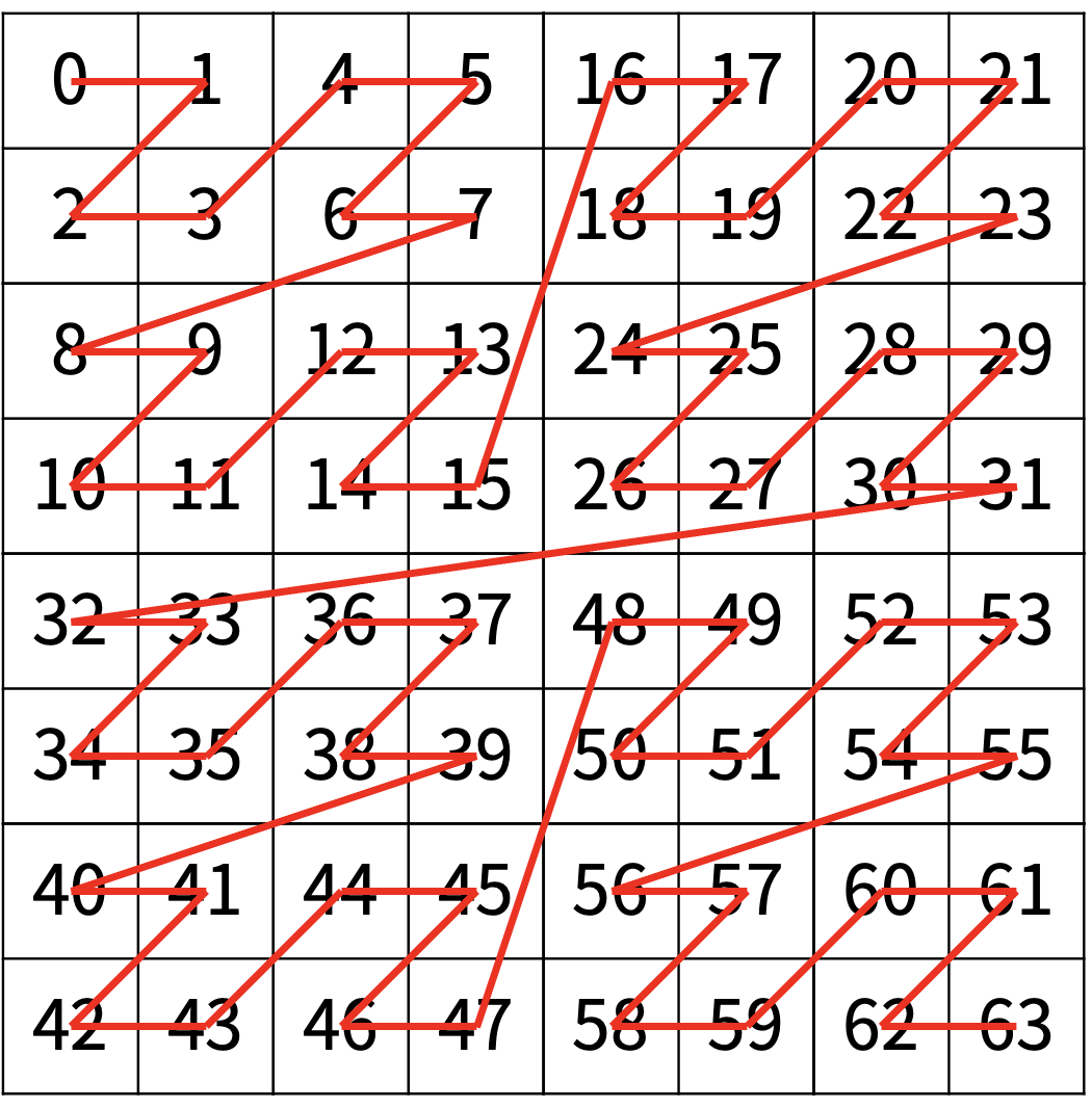 예시만 보고나서는, 2^N-1 * 2^N-1 크기의 박스 4개로 나눈 후, 각 박스별로 z형태로 2*2크기씩 진행하는것으로 이해했다.